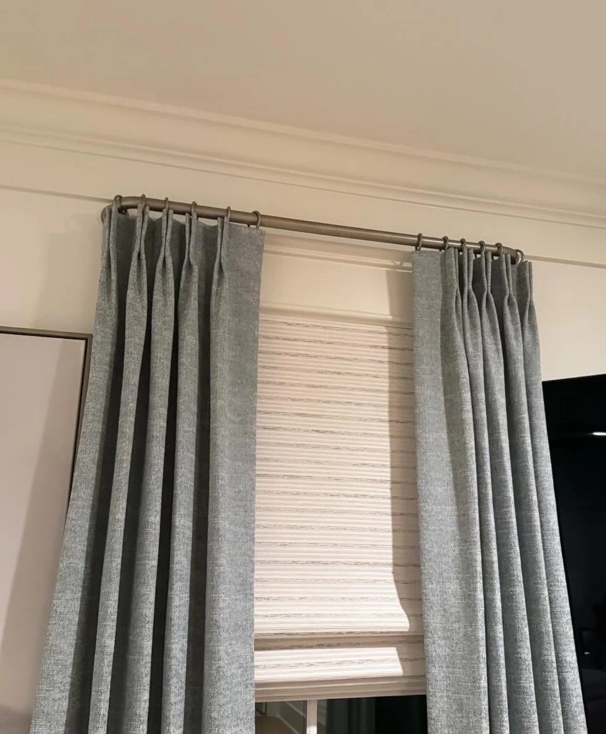 Custom Drapery Panels, Custom hardware layered with a custom Woven Shade