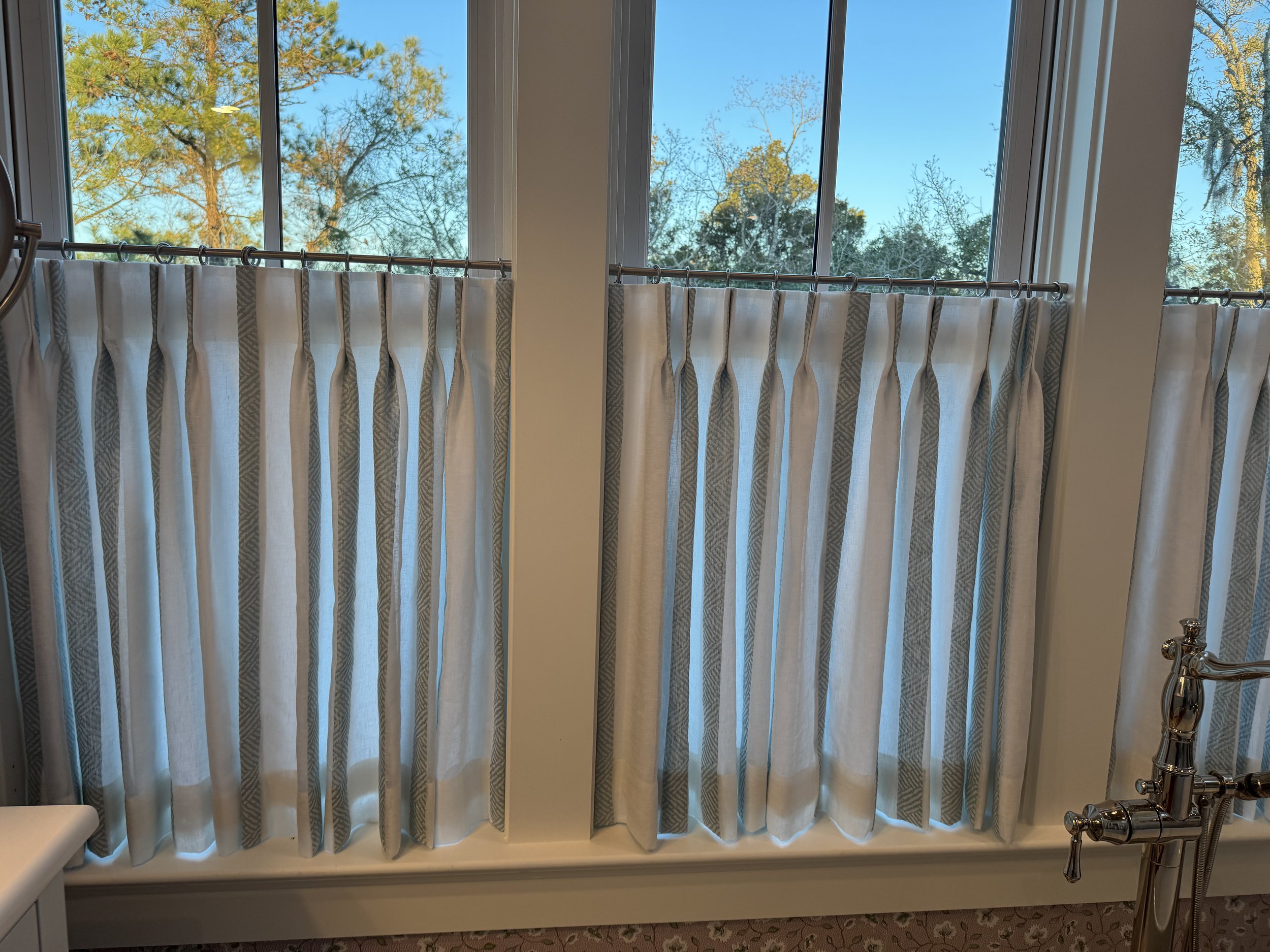 Custom Stationary Panels with Hardware customized to the bends and curves of this space!